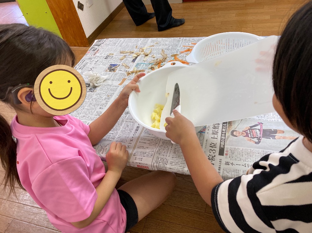 ハイサイ☺️児童発達支援、放課後等児童デイサービスのキッズコートおながヤイビーン☺️祝日㊗️の今日は、みんなでクッキングにチャレンジしました🍳🥕🧅🥔野菜を触ってみたり興味津々の子🥕🧅玉ねぎをむくのが上手な子🥔最後まで野菜を切るのを頑張った子🥕